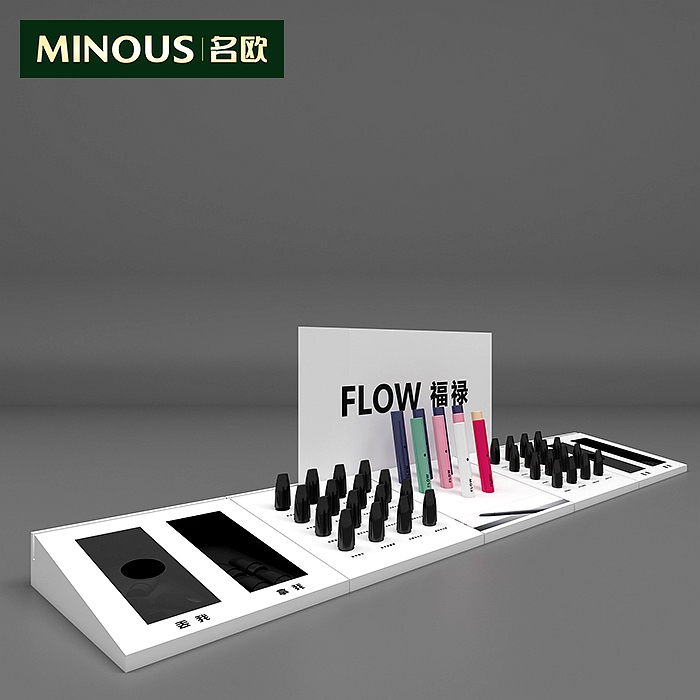 这款的特色就是助推器。电子配件一般体积较小,对于深又窄的储存位置拿取都比较麻烦,设计较大的位置又难以整齐固定住产品又浪费亚克力材料。助推器的设计在亚克力展示架上也是比较常用的。安装上助推器,不管产品放的多还是少,弹簧都会将产品自动弹到最前面,方便选购和拿取。