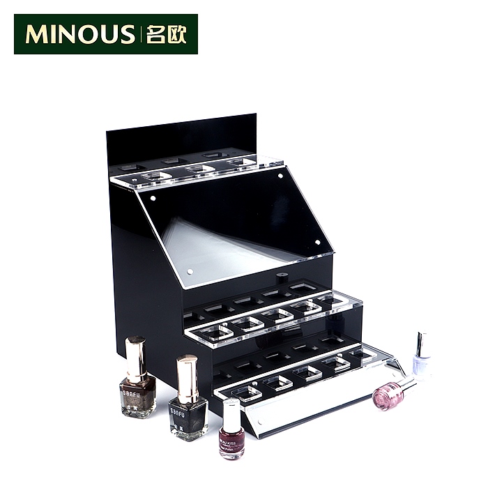 亚克力展示柜普遍以黑色和白色为主基调,面板为一体雕刻,边缘为无缝粘接,经典黑色放至多彩的彩妆用品,让#REF!的展柜更显多姿多彩。