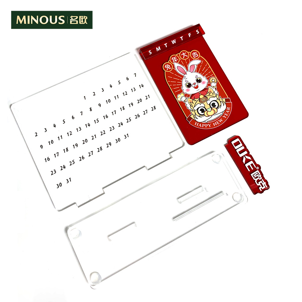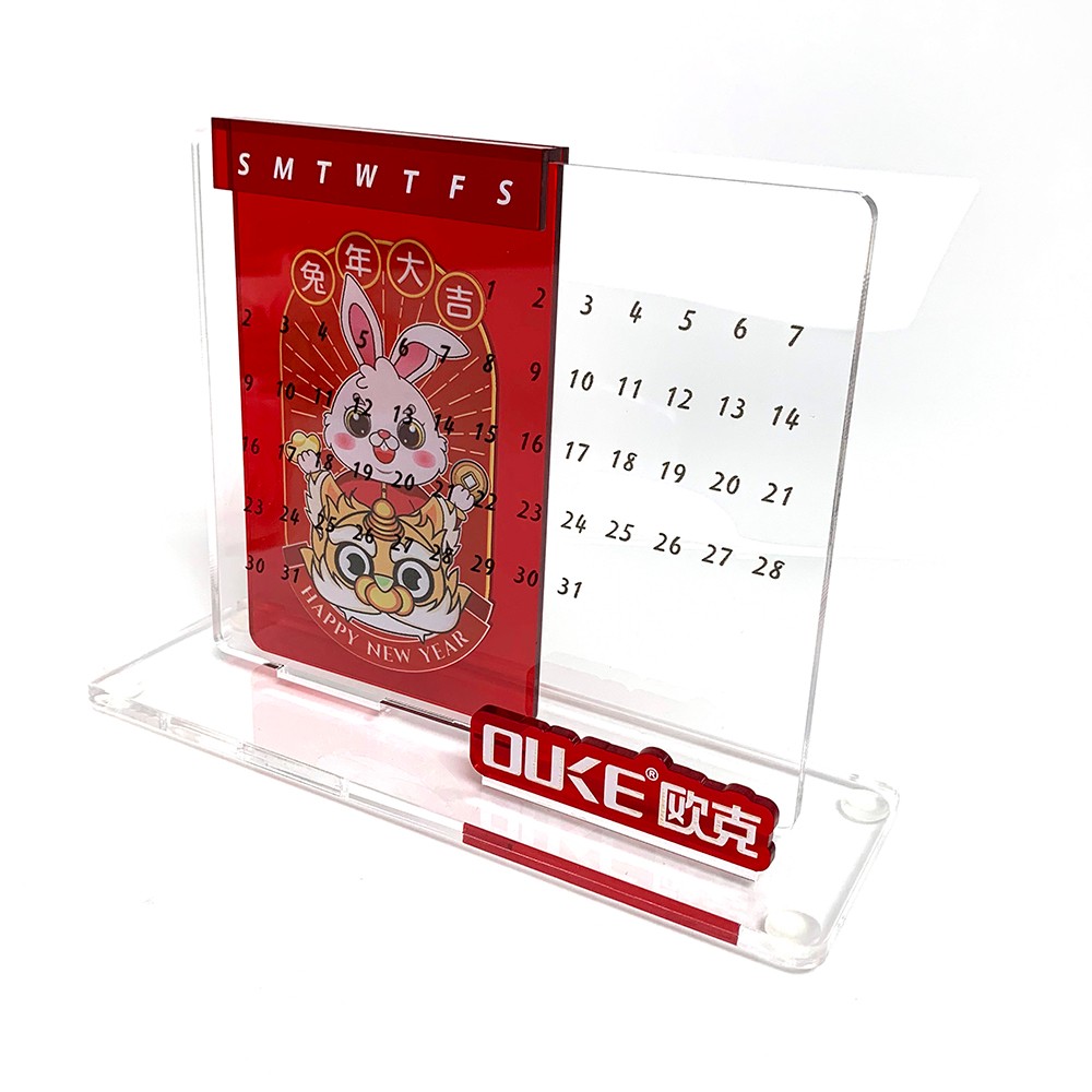 有机玻璃新款兔年台历,可拆卸的台历在运输中更加方便简洁,大红色移动月历板,上面印刷着兔年的标记,彩色的印刷衬托着台历显得更加喜庆,前排站立着小logo,指引着未来的前景以希望,只愿公司和这款台历一样,业绩一路向前,红红火火,一路前行。底部垫着四个小胶垫,把台历往高垫了一个度。