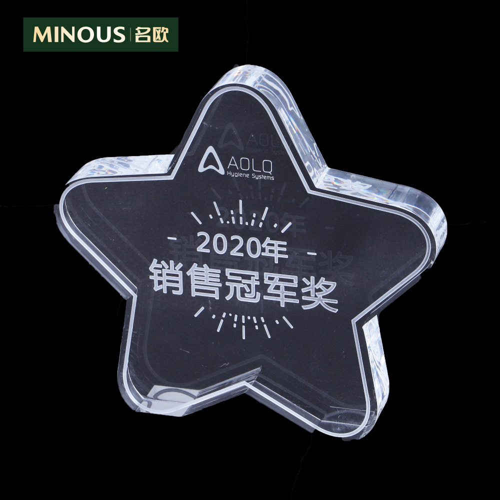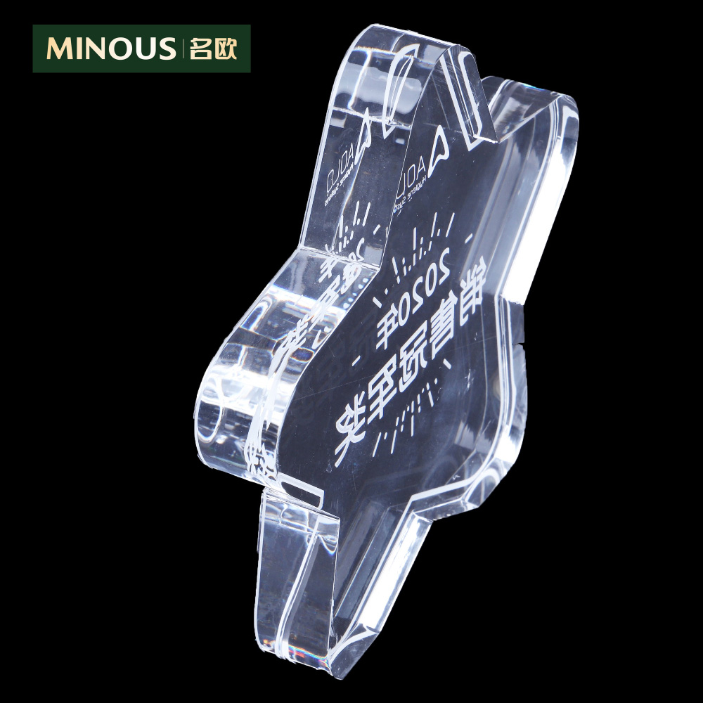 随着亚克力文化的不断发展,目前众多比赛的奖杯都采用亚克力材质制作,每一款精致的亚克力奖杯都是经过手工精细打磨而成的,亚克力奖杯也逐渐在众多材质中脱颖而出。它是一种高尚纯洁的象征,常用于各种赛事、会议庆典、表彰大会、节日庆祝、企事业单位的奖品。它晶莹剔透,闪闪发光,手感细腻,还可以根据不同的要求在上面雕刻各种造型或印刷各种图案logo,亚克力材料透明度可达到92%-95%如水晶般晶莹剔透,用它来做奖品颁发给优秀的人是最合适不过了,这款奖杯采用高精密激光雕刻(无凹凸不平感)+镭射打标(立体有质感)+抛光(圆润不刮手通透十足),#REF!亚克力采用全新浇筑进口优质原材料,持久耐用、耐腐蚀、不开裂、不易发黄、长久使用安全不易碎,透明材质通透十足让您拥有全新的体验感,是一个轻巧、美观、实用的立体纪念奖杯。
