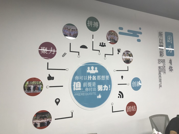 这一周,历时许久的公司文化墙,终于在#REF!钟总个思想指导下,在设计在辛苦做图下,做好了,并且把她安装好在墙上。公司文化墙,是公司文化的重要组成部分,把公司文化内容,做成文化墙的方式,实时展示出来,有利于公司文化的践行。
