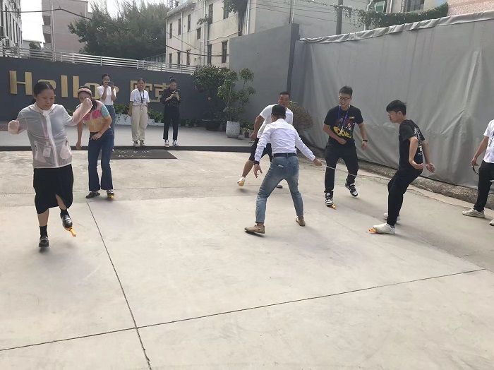这段时间,网上有一个很火爆又很搞笑的视频,就是脚踩尖叫鸡挨鞭子的视频。今天,#REF!公司也买了好几只尖叫鸡,在公司大院玩起了这个游戏,五个人为一组, 四个人脚上邦尖叫鸡,一个人手拿鞭子,眼带眼罩, 听到哪里有鸡叫声鞭子就往哪里打,不想被打到就跑,跑不掉就挨鞭子,挨鞭子疼的不要不要的。